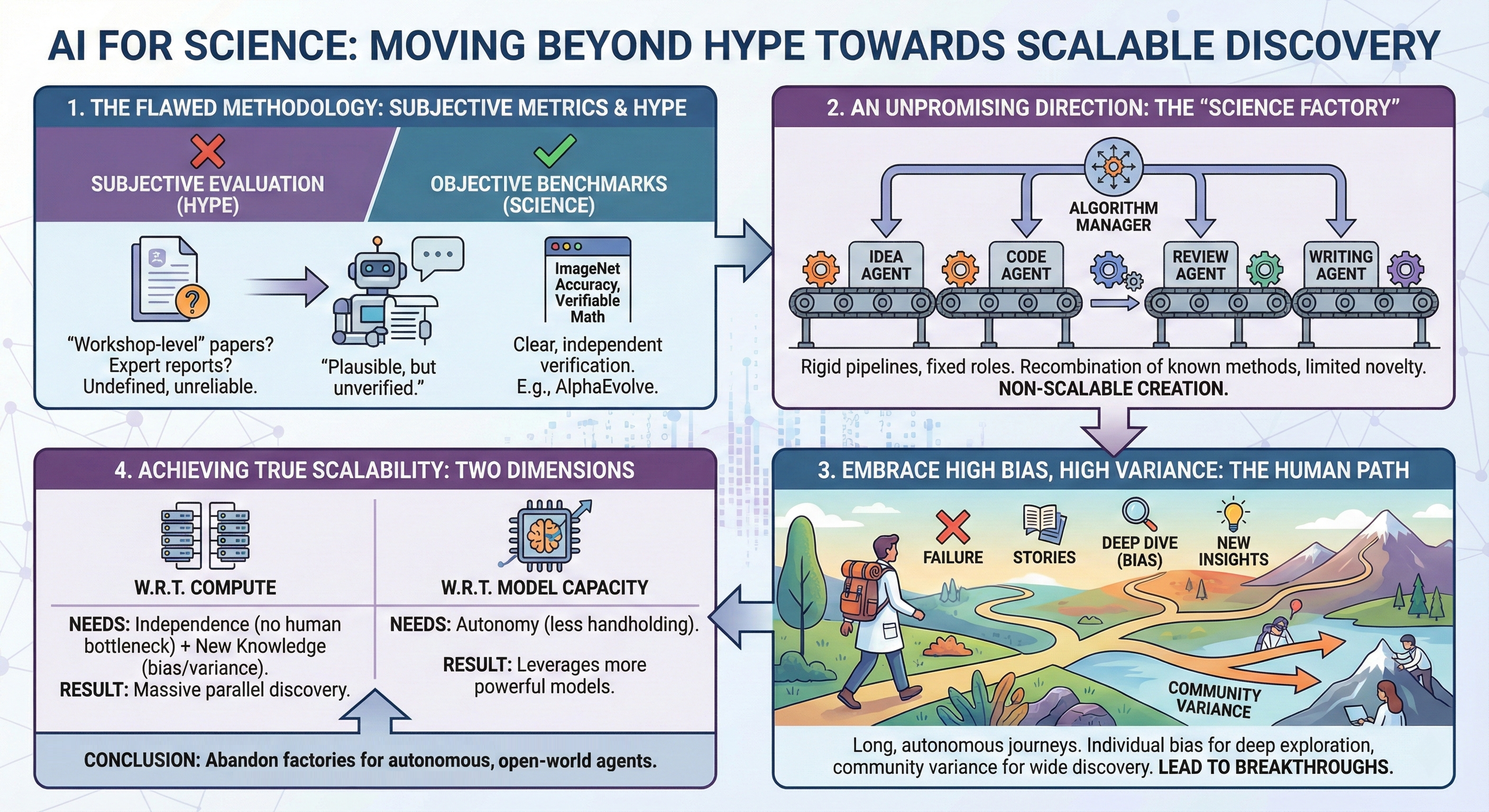 In any case, it is unknown how scalable these approaches are. Say 1% of the generated papers contain novel methods, or 1% of the sentences generate novel insights. The effort required to filter out these papers or insights would likely consume more time than a human expert working on a research project alone, defeating the whole purpose of AI for Science. One cannot simply upscale these approaches — for example, by deploying thousands of runs simultaneously — because each output requires rigorous verification by experts. It is, at best, similar to a researcher hiring a team of untrustworthy research interns who may occasionally produce good work. The researcher will easily be overwhelmed when the size of the team grows large.